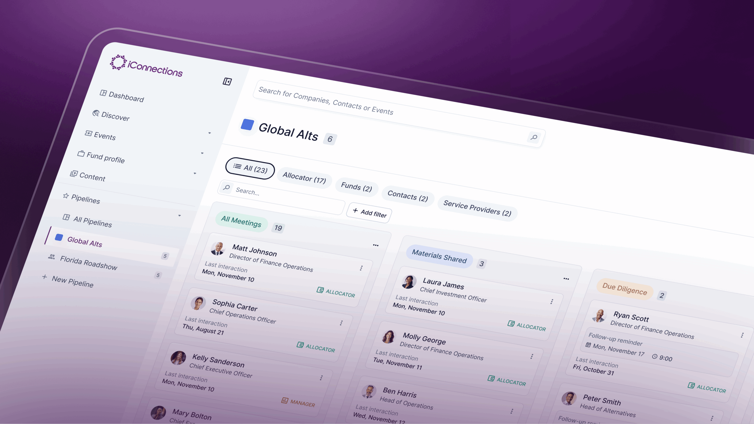Finally, a lightweight CRM that lives inside iConnections. Track every LP and GP interaction, from the initial meeting to follow-up, without leaving the platform.